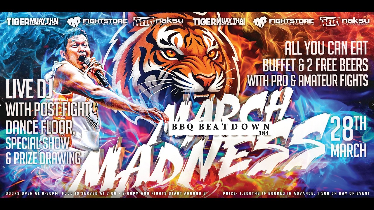 Tiger Muay Thai presents: BBQ Beatdown 184: March Madness Pro and Amateur Muay Thai, MMA and Boxing Fights LIVE! from the paradise island Phuket, Thailand Train with us: https://www.tigermuaythai.com/online-booking Get TMT gear: https://www.tmtfightstore.com/en/ Subscribe for more training, instructional and fight videos: youtube.com/tigermuaythai?sub_confirmation=1