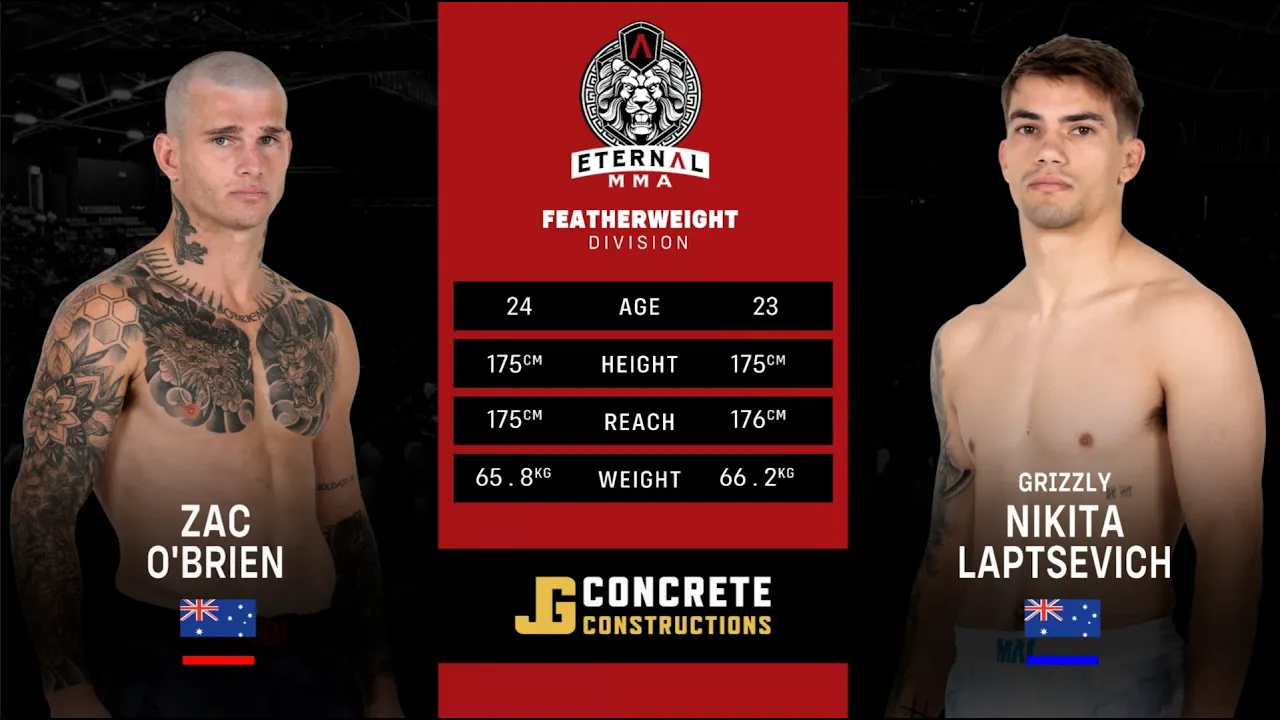 π₯ Welcome to Eternal MMA 98 ! π₯ Watch as Zac O'Brien takes on Nikita Laptsevich in a thrilling matchup that showcases the best of Australian mixed martial arts! Eternal MMA is proud to be Australia and New Zealand's premier MMA promotion, bringing you the most electrifying fights from across the region. π About Eternal MMA: Based on Queensland's Gold Coast, we promote up to 11 events per year, featuring a talent pool filled with the finest MMA athletes, from rising amateurs to seasoned pros. Our events are known for their intensity, with undercards showcasing top amateur fighters from the Australia-Pacific region, and main cards packed with professional athletes in the most competitive bouts. π₯ Why You Should Watch: - Experience the excitement of live MMA action. - Discover the future stars of the sport. - Enjoy exclusive highlights, KO's, TKO's, and submission victories! π Don't forget to subscribe to the Eternal MMA YouTube channel for all the latest fights and highlights, including full fight recaps, behind-the-scenes content, and more! Follow Us: - Facebook: Eternal MMA - Instagram: @EternalMMA - TikTok: @eternalmma - OnlyFans: Eternal MMA - Threads: @eternalmma π For more information, visit www.eternalmma.com. Join the conversation using hashtags: #EternalMMA #MMA #FightNight #AustralianMMA #FullFight #UFC #UFCFightPass