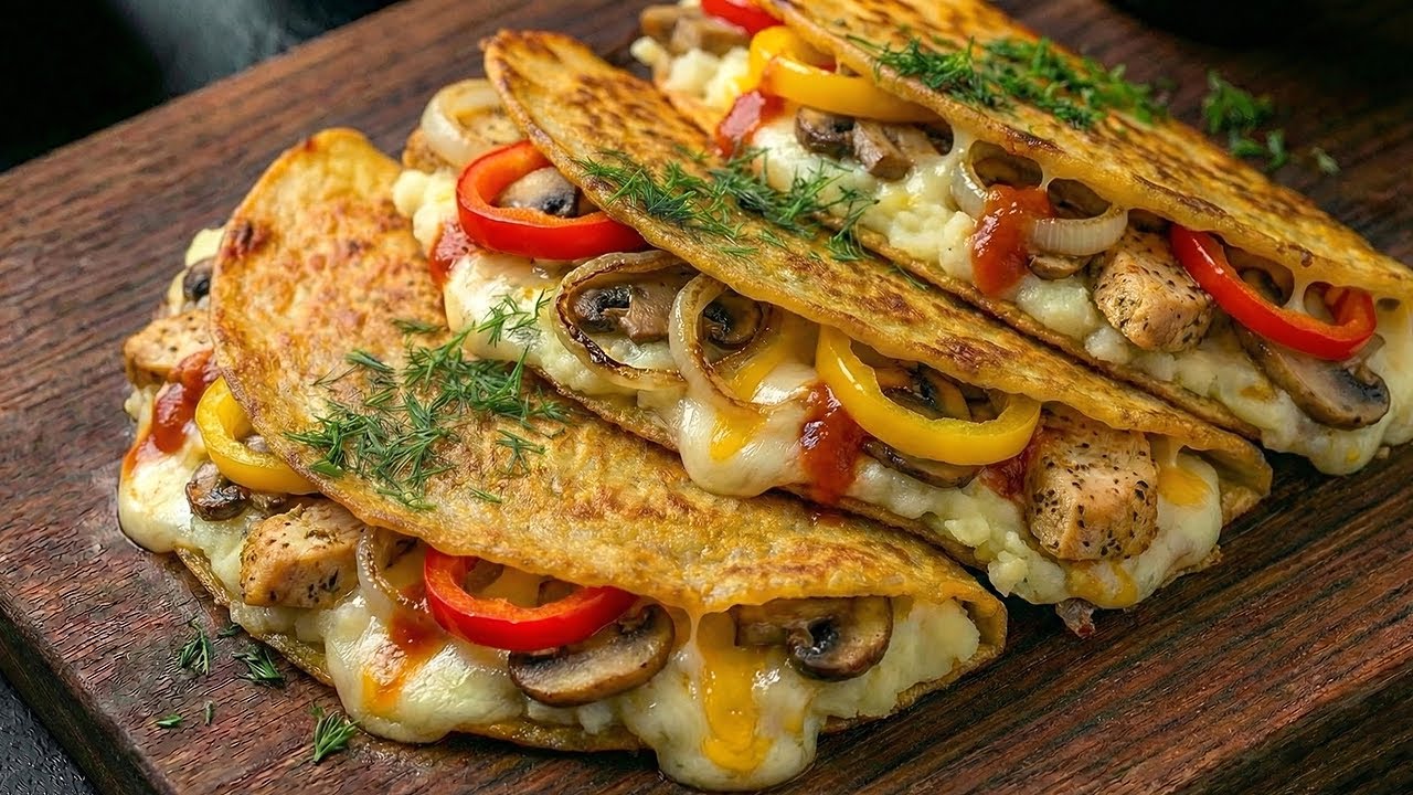This is the most popular tortilla recipe — simple, quick, and incredibly delicious! In this video, I show you how to make an easy tortilla dish that has already won the hearts of thousands of people. With minimal ingredients and a few simple steps, you’ll get a perfectly crispy tortilla with a warm, flavorful, and cheesy filling that tastes amazing every time. Ingredients: 5 tortillas, 1 potato, 3 tbsp olive oil, 1 onion, mushrooms, yellow pepper, chicken breast 7 oz (200 g), red bell pepper, salt, black pepper, paprika, 1 tsp garlic powder, spring onions, parsley, parmesan cheese, mozzarella cheese 7 oz (200 g). 👏 Give this video a thumbs-up to support the channel’s growth! #tortilla