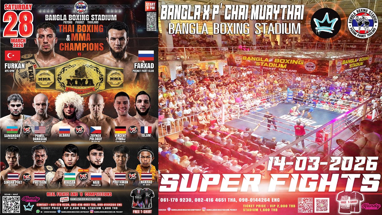 LIVE BANGLA MMA & KICKBOXING Real Fight 28th March 2026 Two worlds collide in a battle of skill, strength, and heart. Who will reign supreme in this Kickboxing & MMA superfight? FREE T-shirt! 👕 SATURDAY NIGHT SUPER FIGHT 🥊🥊 28th March 2026 🔥🔥BANGLA BOXING STADIUM🔥🔥 Every Tuesday, Wednesday ,Friday, Saturday and Sunday night. Gate open : 8:30PM. Start time : 9PM. #banglaboxingstadium #banglapatong #thaiboxing #phuketboxingstadium #muaythaiphuket #thaiboxingphuket #kickboxing #MMA #phuket #patong