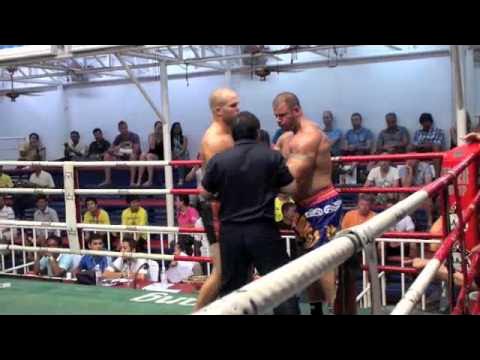 Fighting for Tiger Muay Thai & MMA Training Camp, Phuket, Thailand, Fight Team Prospect Patrick Schmid defies the physical odds mashing into his massive opponent with brutal punch combos/elbows and legs kicks stopping him @ Bangla Thai Boxing Stadium on Dec 14th 2011
